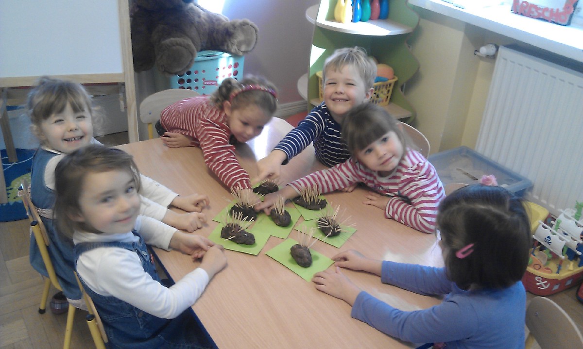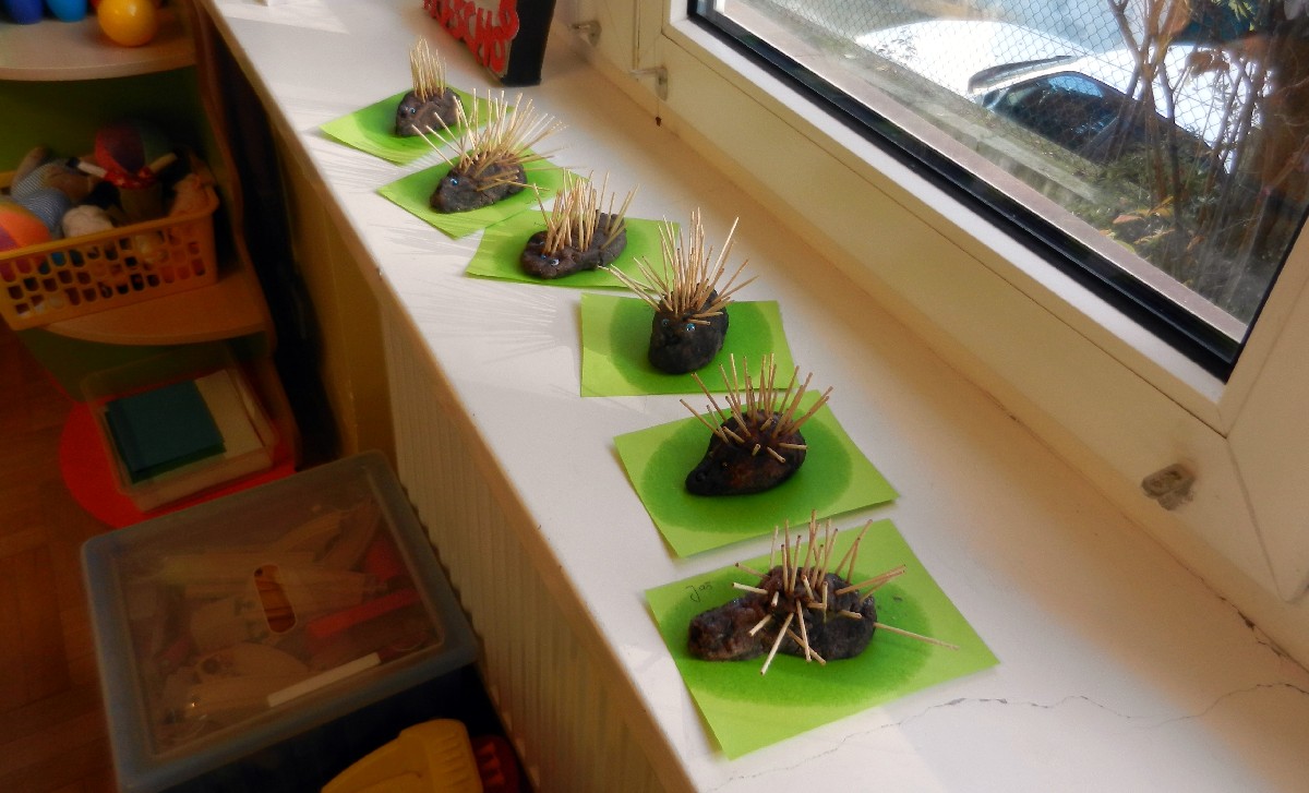 Dzisiaj uczyliśmy się o jeżach – oglądaliśmy zdjęcia i opisywaliśmy je. Nauczyliśmy się, jak spędzają jesień i jak przygotowują się na zimę. Nasze fantastyczne jeżyki zrobiliśmy z ciastoliny i wykałaczek – była przy tym masa zabawy!